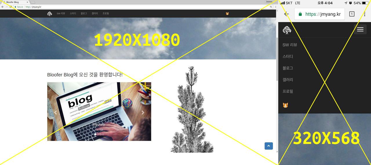 본 홈페이지도 부트스트랩으로 만들어졌는데, 위 사진에 보듯이 브라우저 해상도에 따라서 화면 컴포넌트 배치가 달라진다. 핸드폰 해상도(아이폰5S) 320X568에서의 디스플레이와 모니터 해상도(13인치 Dell xps 노트북) 1920X1080에서의 디스플레이가 자동으로 맞추어 예쁘게 보여진다.