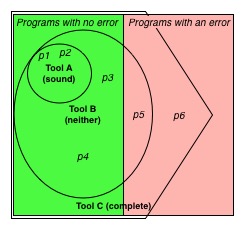 위 그림은 이러한 상황을 시각적으로 나타내준다. 좌측에 있는 초록색 사각형이 Sound해야하는 특정 성질을 나타내고, 절대 런타임 에러를 내지 않는다. 좌측 상단 원형의 분석 꼴은 이러한 Sound한 성질을 완전히 만족시키는 분석기 A를 나타낸다. 이 경우 프로그램 p1과 p2를 커버하지만 해당 원 밖에 있는 프로그램에 대해서는 Sound하더라도(p3, p4) 오탐을 낼 것이다. 그럼에도 불구하고 분석기 A는 좌측 초록색 사각형에 완전히 속하기 때문에, Sound하다고 볼 수 있을 것이다.