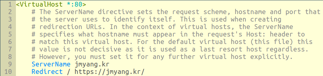 아파치 설정 파일에 redirect 태그를 통해 강제 리디렉션을 해주도록 한다. 이제 홈페이지에 HTTP로 접속한 사용자도 강제로 HTTPS로 리디렉션된다.