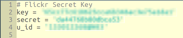 나의 경우, 이처럼 하나의 파일로 빼 놓은 다음, git에서 ignore 시켜놓았다. 여기서 u_id는 내 Flickr 계정의 키 값인데, 내가 플리커 포토스트림에 올려놓은 사진들에 접근할 때 사용하는 값이다.